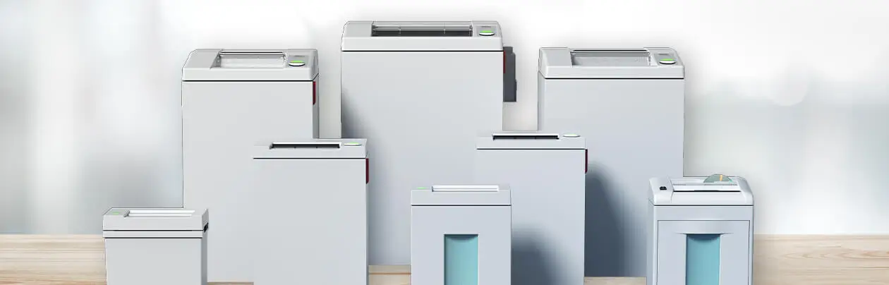 Mit dem IDEAL-Sortiment finden alle Ihre alten Unterlagen den Weg in die Tonne: Um einzelne Dokumente kümmert sich der Schreibtisch-Aktenvernichter, ganze Papierberge bezwingt der Großmengen-Shredder.