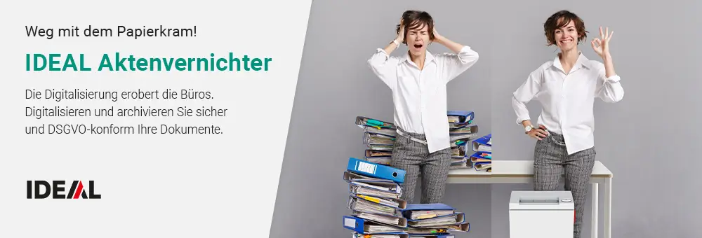 Die Digitalisierung erobert die Büros. Dokumente einfach zu scannen, reicht aber nicht aus. Vertrauliche Papiere müssen nach der Archivierung vernichtet werden – zügig und DSGVO-konform. Neben jeden Scanner gehört deshalb ein IDEAL Aktenvernichter.