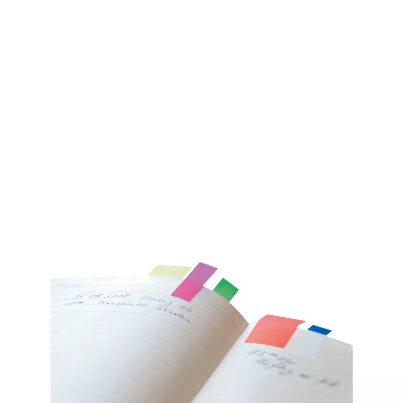 Transparente Index Haftstreifen mit farbigen Taben. Die beschriftbaren Streifen sind selbsthaftend und rückstandslos ablösbar.