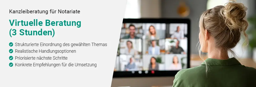 Die virtuelle Beratung ist ein individuelles Arbeitsformat für Notarinnen und Notare, die ein konkretes Thema aus dem Kanzleialltag strukturiert einordnen und weiterdenken möchten.