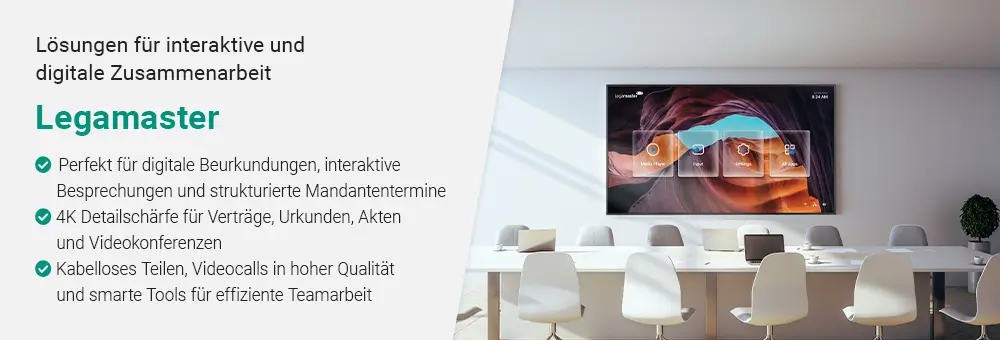 Moderne juristische Arbeit lebt von klarer Kommunikation, strukturierter Dokumentenarbeit und der Fähigkeit, Mandanten verständlich durch komplexe Sachverhalte zu führen. Der EVOLVE PRO unterstützt Notare und Rechtsanwälte in all diesen Bereichen – als vollständig interaktives Touch‑Display für digitale Beurkundungsvorbereitungen, interaktive Besprechungen und effiziente Teamarbeit.