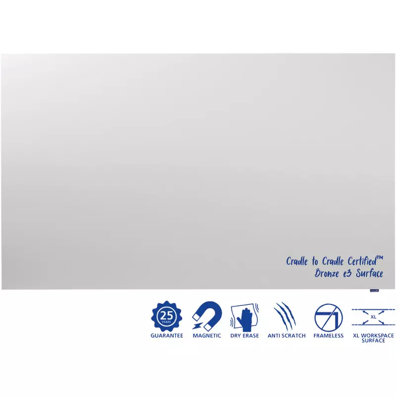 | Beschreibung der Besonderheiten: | Hochwertiges rahmenloses und kratzfestes Whiteboard für langfristige und intensive Nutzung. Beschreibbar mit trocken abwischbaren Whiteboardmarkern. Magnetische Oberfläche aus emailliertem e³™-Keramikstahl, Cradle to Cradle Certified®, Bronze-Level. Das r |