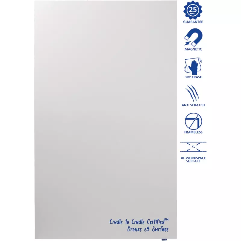 | Beschreibung der Besonderheiten: | Hochwertiges rahmenloses und kratzfestes Whiteboard für langfristige und intensive Nutzung. Beschreibbar mit trocken abwischbaren Whiteboardmarkern. Magnetische Oberfläche aus emailliertem e3-Keramikstahl, Cradle to Cradle Certified™, Bronze-Level. Das ra |