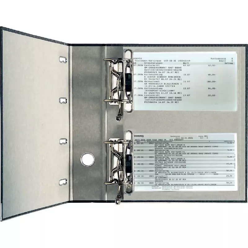 Besonders stabiler Einband mit 2 Präzisionsmechaniken zur Ablage von 2 x DIN A5 quer, z. B. Kontoauszüge.