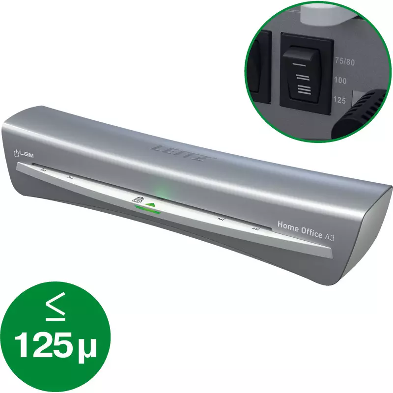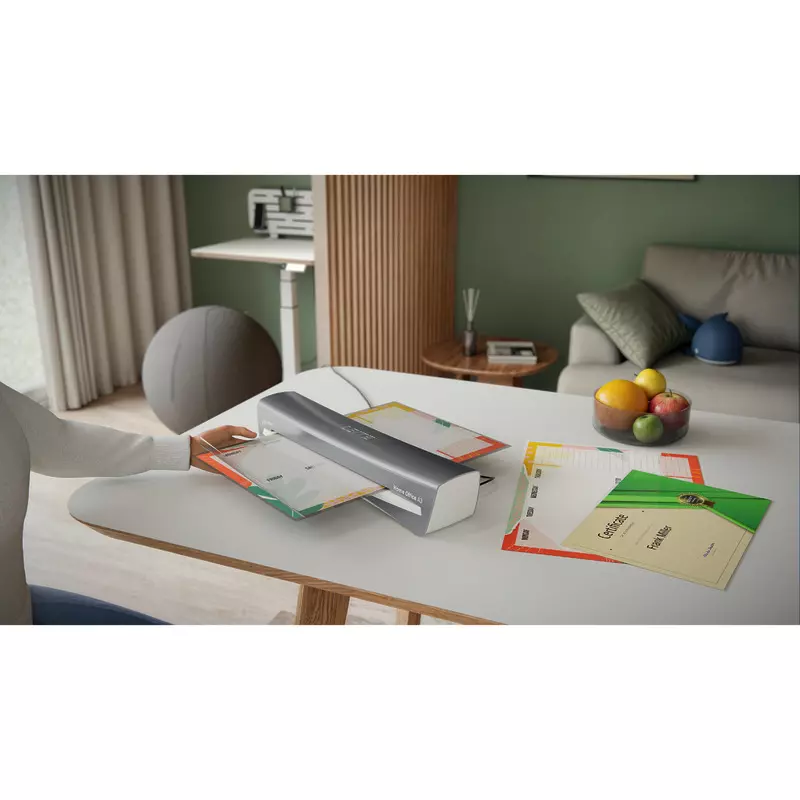 Das elegante und kompakte Laminiergerät Leitz iLAM Home Office verbindet modernes Design mit Funktionalität. Dieses praktische A3-Laminiergerät verfügt über eine kurze Aufwärmzeit von 2 Minuten und laminiert ein A4-Blatt mit einer Stärke von 80 Mikron in nur 45 Sekunden. Mit dem benutzerfreundlichen Wippschalter können Sie zwischen drei Folienstärkestufen wählen und so einen vielseitigen Einsatz für alle Ihre Laminieranforderungen gewährleisten. Der Anti-Stau-Auslösehebel garantiert einen reibungslosen Betrieb, indem er mühelos alle falsch eingezogenen oder eingeklemmten Beutel beseitigt. Die innovative, intelligente Status-LED verbessert die Benutzerfreundlichkeit mit intuitiven LED-Farben und Tönen: rot während des Aufwärmens, grün mit einem akustischen Signal, wenn das Gerät bereit ist, und rot blinkend für die automatische Abschaltung nach 15 Minuten Inaktivität. Schützen Sie Ihre Dokumente schnell, effizient und stilvoll. Silberne und weiße Farbe.