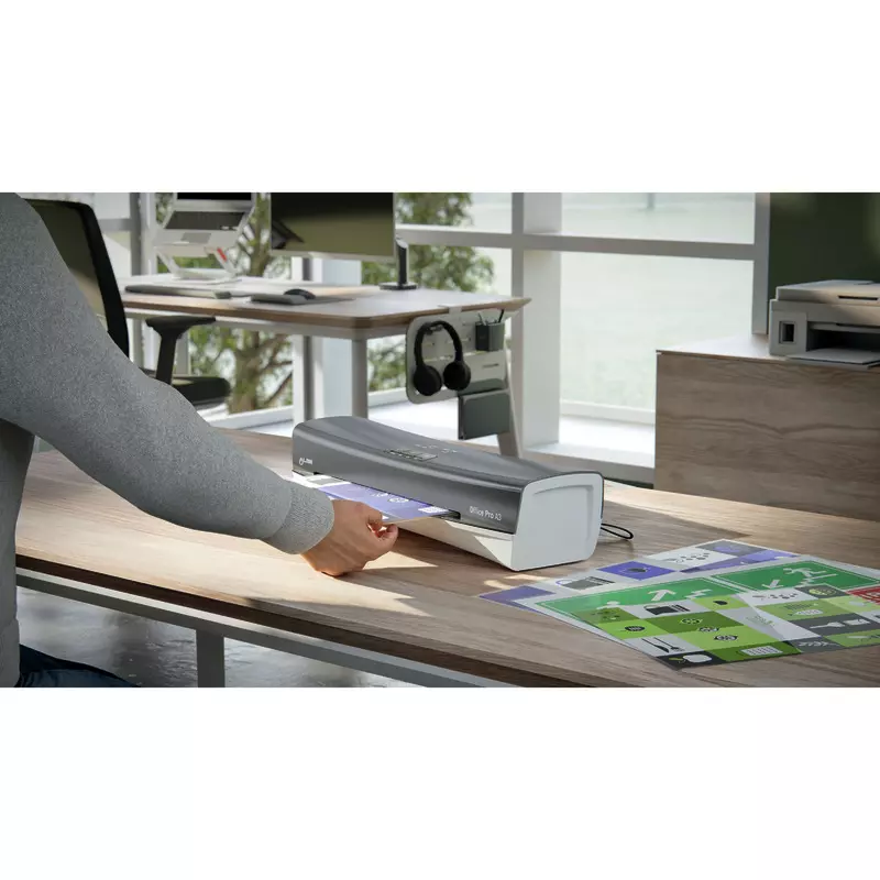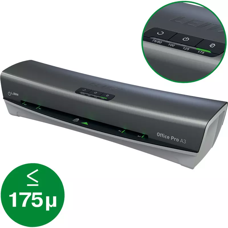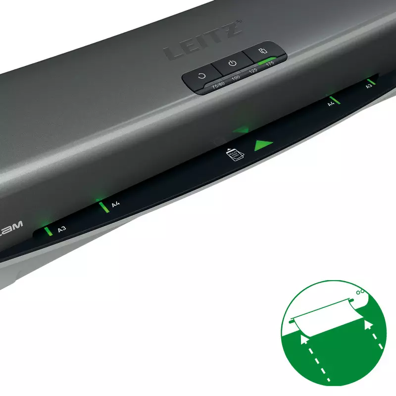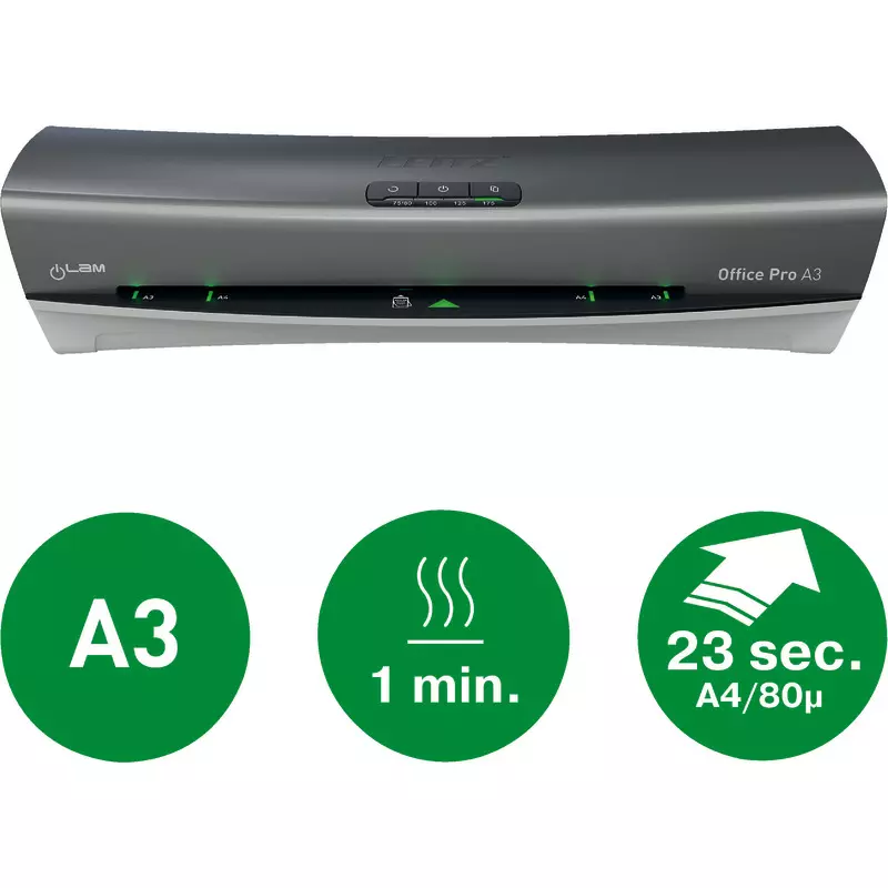 Das Leitz iLAM Office Pro A3 Laminiergerät verbindet gekonnt Stil und hohe Leistung. Dieses für den mühelosen Betrieb konzipierte A3-Laminiergerät zeichnet sich durch eine schnelle Aufwärmzeit von 1 Minute aus und kann ein A4-Blatt mit 80 Mikron in nur 23 Sekunden laminieren.