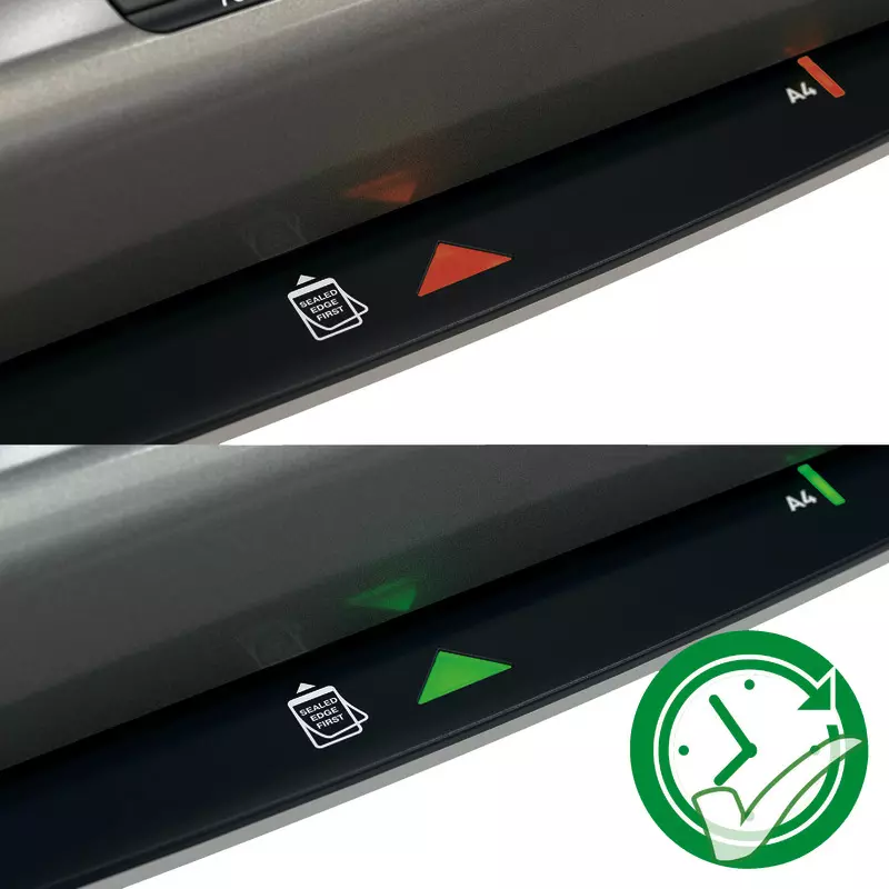 - SMART-Eingangsführungs-LEDs: stellen sicher, dass die Folien gerade durch das Laminiergerät geführt werden, um Staus zu vermeiden