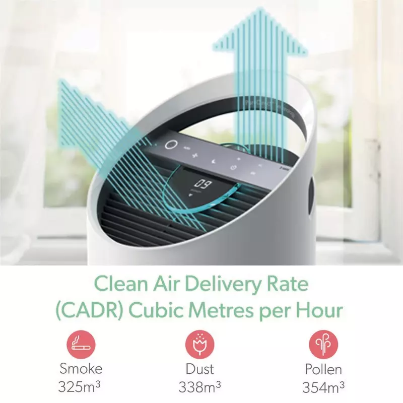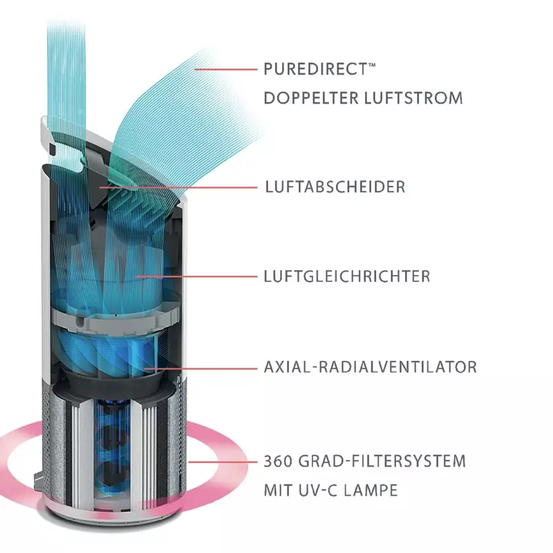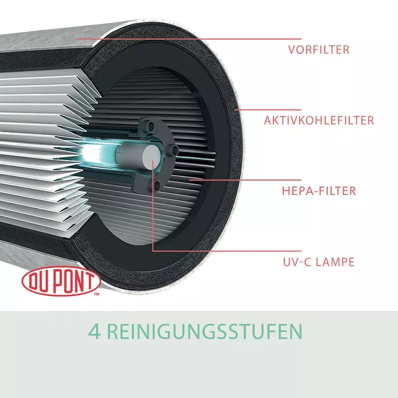- Der 360 Grad HEPA-Filter fängt 99,97 % aller luftübertragenen Schadstoffe (z.B. Feinstaub, Allergene, Bakterien und Viren) ab einer Größe von 0,3 Mikron