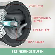 Das 360 Grad-Filtersystem erfasst übliche Schadstoffe wie Allergene, flüchtige organische Gase und ultrafeine Partikel. Die im Filter integrierte UV-C Lampe liefert eine zusätzliche Desinfektionsstufe. Wenn luftübertragene Bakterien und Viren, die sich auf dem Filter ansammeln können, den Wellenlängen des UV-C Lichts ausgesetzt sind, werden diese inaktiv und können sich nicht mehr reproduzieren.