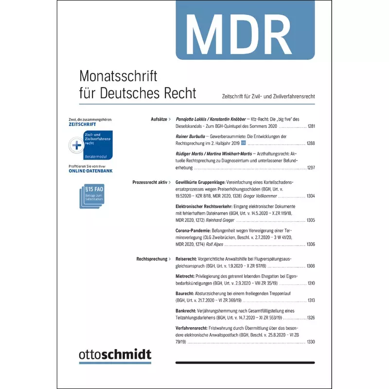 Die Fachzeitschrift MDR – Monatsschrift für Deutsches Recht ist seit Jahrzehnten das bewährte Arbeitsmittel für die Zivilrechtspraxis. Speziell auf die Bedürfnisse der Anwälte und Richter zugeschnitten, kanalisiert sie die Informationsflut, gibt wichtige Praxishilfen und hält gleichzeitig auf dem neuesten Stand der Rechtsprechung.