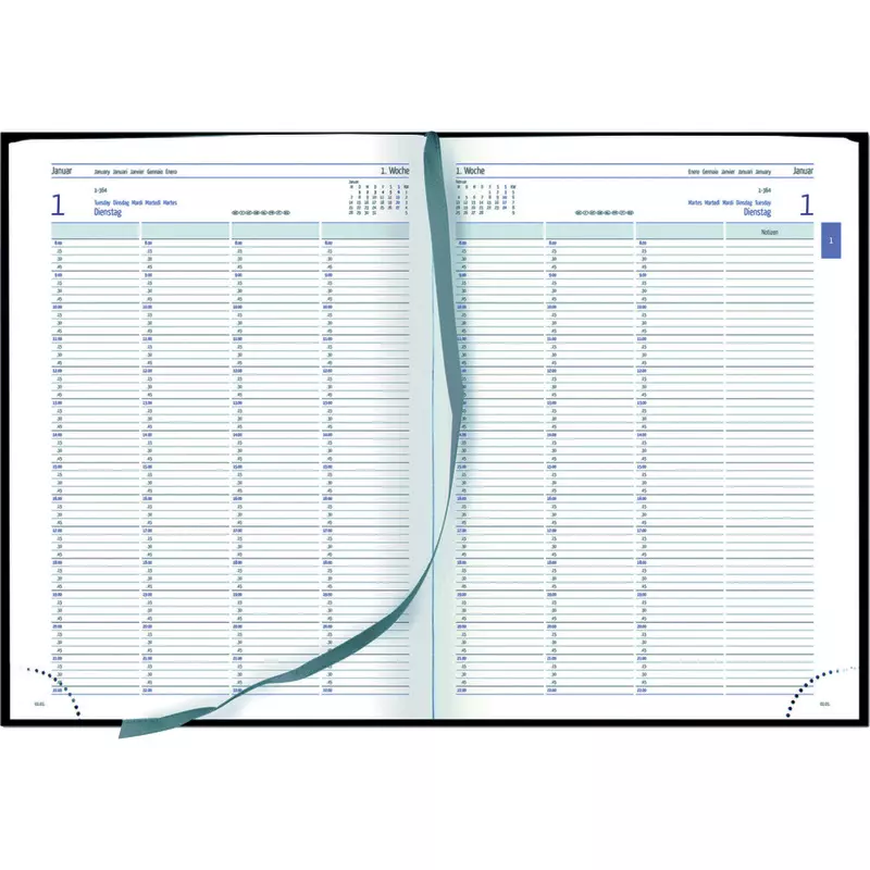 Eine Doppelseite pro Tag mit sieben Spalten zur parallelen Eintragung von Terminen plus eine Notizspalte bieten ausreichend Platz für alle Eintragungen.