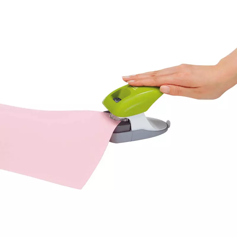 Mit kraftunterstützendem Mechanismus wird eine vom Hefter gestanzte Papierlasche automatisch durch einen ebenfalls gestanzten Schlitz gezogen. So werden bis zu 10 Blätter ohne Klammern zusammengeheftet. Mit dem transparenten Sichtfenster lässt sich die Heftung an der gewünschten Stelle positionieren. Falls die gebundenen Seiten direkt abgeheftet werden sollen, wird ein DIN A4-Dokument mit Hilfe des Abstandsmessers einmal von oben und einmal von unten geheftet. Der Abstandsmesser wird anschließend platzsparend in das Gerät eingeschoben.