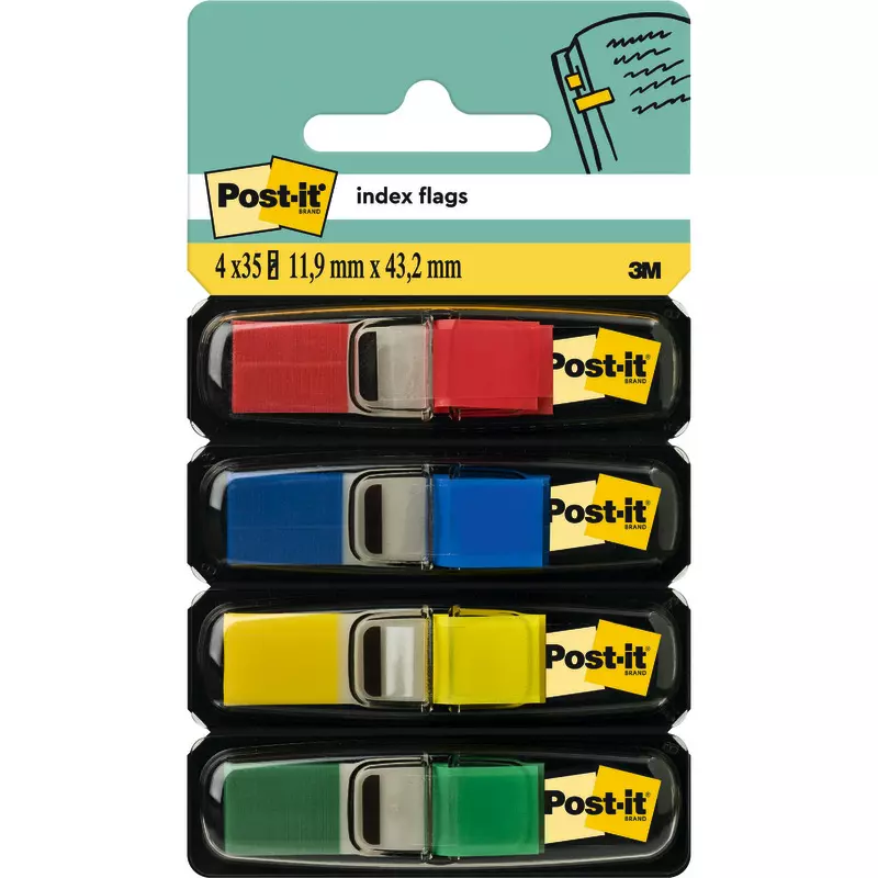 Produktinformationen "Post-it® Index Haftstreifen, Mini, Gelb, Rot, Blau und Grün, 35 Haftstreifen/Spender, 4 Spender/Packung"