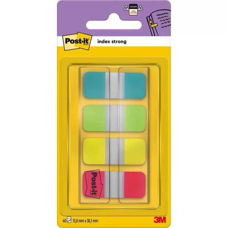 Produktinformationen "Post-it® Index Strong Ablagetabs, Mini, Gelb, Rot, Blau und Grün, 40 Haftstreifen/Spender, 1 Spender/Packung"