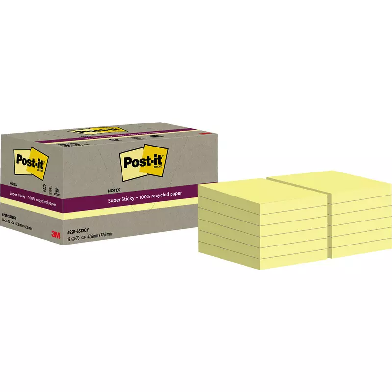 Post-it® Super Sticky 100 % Recycling Notes, Gelb, 47.6 mm x 47.6 mm, 70 Blatt/Block, 12 Blöcke/Packung