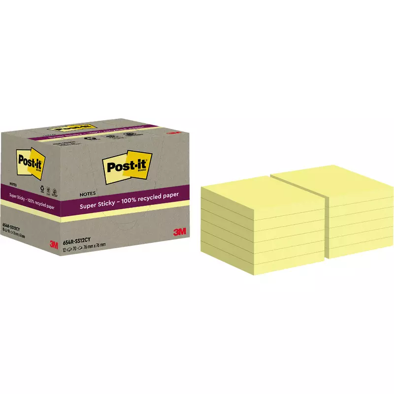 Post-it® Super Sticky 100 % Recycling Notes, Gelb, 76 mm x 76 mm,12 Blöcke/Packung