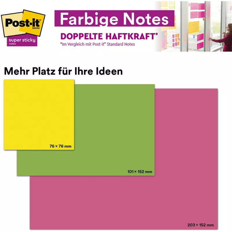 Post-it® Super Sticky Notes im Großformat haften stärker und halten länger. Sie haften doppelt so stark wie Post-it® Standard Notes, sodass dein Gedanke sicher ankommt. Sie sind extra stark haftend, vielseitig einsetzbar und sorgen dafür, dass deine Mitteilungen gut sichtbar sind.