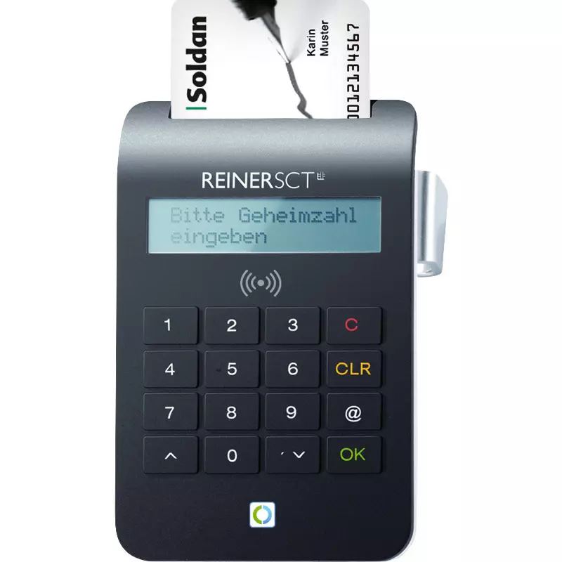 Der cyberJack® RFID komfort von Reiner SCT ist ein Chipkartenleser, der nahezu alle Anwendungen von kontaktbehafteten und -losen Chipkarten,wie z.B. die Soldan Signaturkarte, unterstützt. Maximale Sicherheit, da nur die Daten ausgelesen werden, die per PIN freigegeben sind.