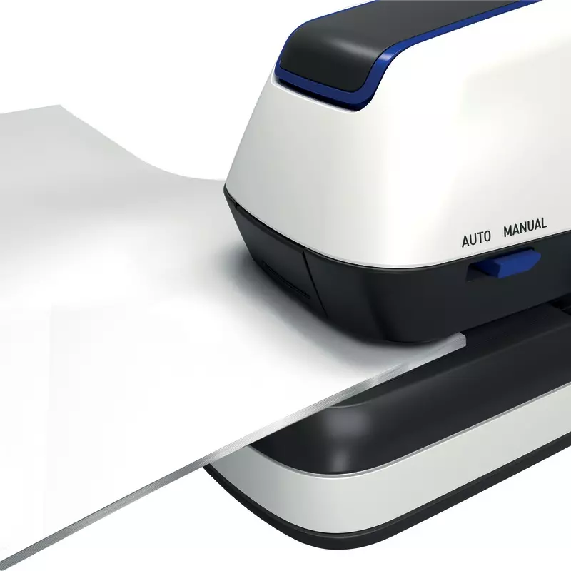 Bequemes und müheloses Heften, vollautomatisch oder manuell gesteuert, einfacher Wechsel zwischen automatischem und manuellem Heften. Präzise Positionierung der Heftklammern mit Hilfe der aufgedruckten Hilfslinien für die Klammerplatzierung. Bei Verwendung von Optima 56 Heftklammern sorgt die Jam-Free-Technologie jederzeit für eine präzise Heftung.