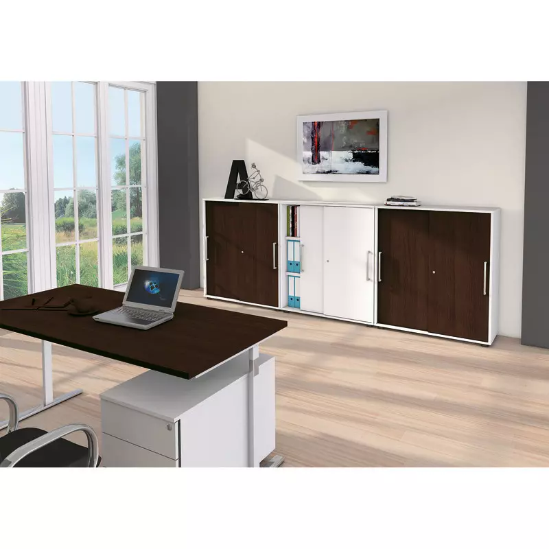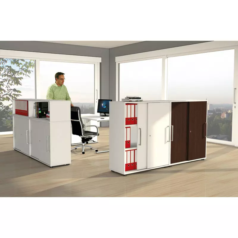 Die Schränke sind stapelbar. Korpus und Schiebetüren in Weiß. Die Schränke sind mit Stahlböden ausgestattet. Die Tragkraft ist weitaus höher als die Tragkraft der üblichen Holzböden. Stahlböden tragen 50 kg ohne sich zu verbiegen. Des Weiteren verfügen die Schränke über eine Sichtrückwand für freie Aufstellung. Der Höhenausgleich erfolgt von innen. Zusätzlich gibt es Aufsatzelemente ohne Türen mit einer Ordnerhöhe.