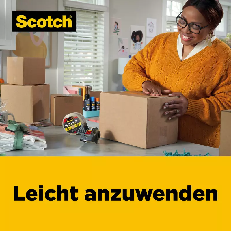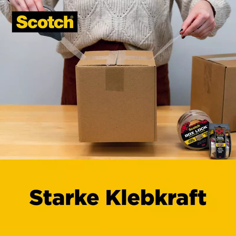 Das kristallklare Scotch® Box Lock™ Verpackungsband hat eine extreme Klebkraft und klebt sofort auf den meisten Kartons, einschließlich schwer zu beklebender Kartons sowie 100% recycelter Kartons.