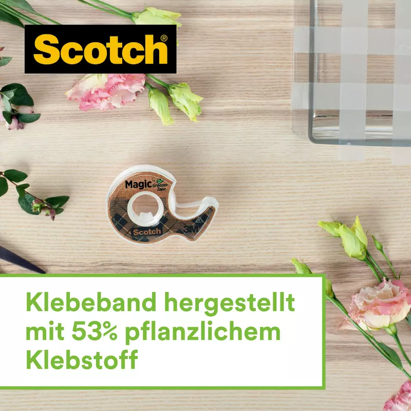- HERGESTELLT MIT 66% PFLANZENBASIERTEM KLEBSTOFF: Das Trägermaterial dieses Klebebands besteht zu 53% aus erneuerbarem Material und das Klebeband verwendet einen 66% pflanzenbasierten und lösungsmittelfreien Klebstoff mit einem Klebebandkern aus 98% recyceltem Kunststoff. TÜV Austria, eine unabhängige internationale Prüf- und Zertifizierungsinstitution, hat den Prozentsatz der erneuerbaren Rohstoffe, die zur Herstellung dieses Produkts verwendet werden, zertifiziert und dem Scotch® Magic™ Klebeband mit erneuerbarem Klebstoff eine Bewertung von 2 Sternen verliehen