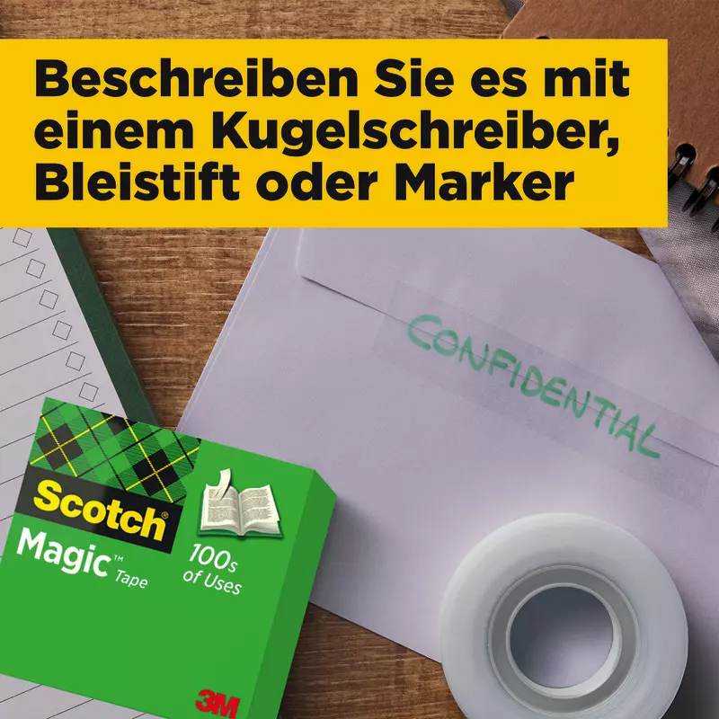 Das Scotch® Magic™ Klebeband ist das originale unsichtbare, matte Klebeband zum Ausbessern und Reparieren aller kleinen Unebenheiten zu Hause, in der Schule und im Büro. Das Klebeband bietet eine starke, sichere und dauerhafte Abdichtung mit der bewährten 3M Klebetechnik, die nach dem Anbringen wieder unsichtbar wird.