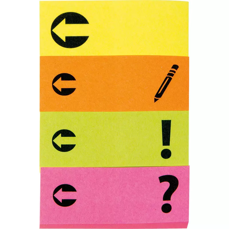 Haftmarker aus Papier in den Farben Gelb, Orange, Grün und Pink mit unterschiedlichen Symbolen wie Pfeile oder Fragezeichen, zum genauen Markieren und Kennzeichnen. Die Marker sind beschriftbar, rückstandsfrei wiederablösbar und umweltfreundlich durch lösemittelfreien Klebstoff. Im Lieferumfang sind 4x40 Blatt im Format 20x50 mm enthalten. Besonders praktisch zum umfangreichen Markieren, Strukturieren und Organisieren.