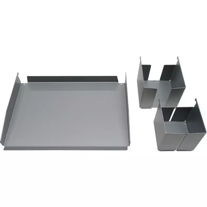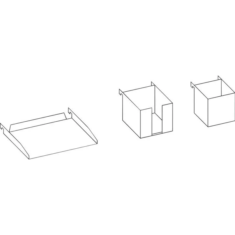 Orga-Set bestehend aus einer Stiftebox, einer Papierbox und einer A4-Ablage. Passend für die Orga-Schienen von Hammerbacher. Der silberne Stahl verleiht Ihrem Arbeitsplatz eine elegante Optik.