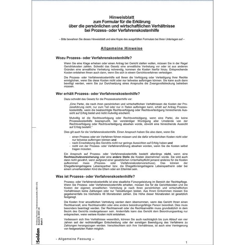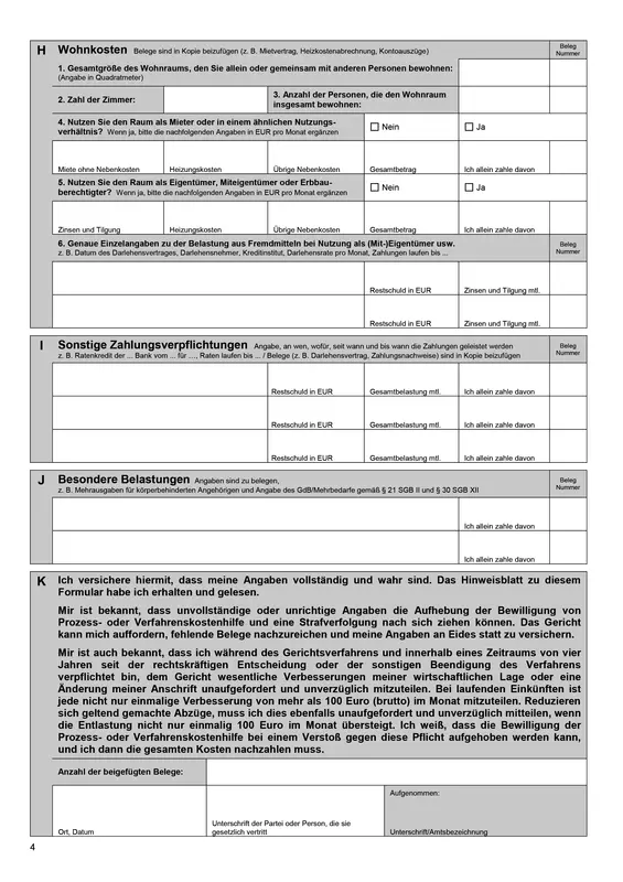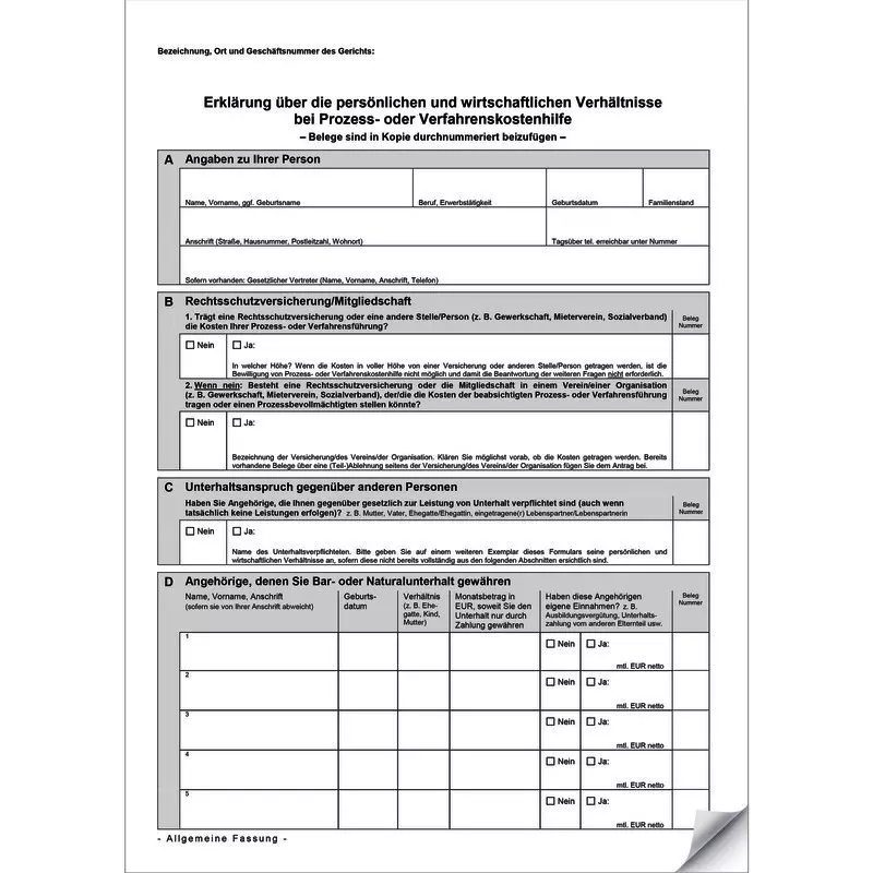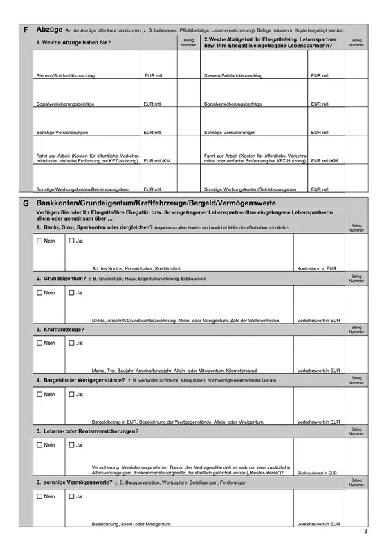Vordruck zur Erklärung zu Einkommens- und Vermögensverhältnissen.