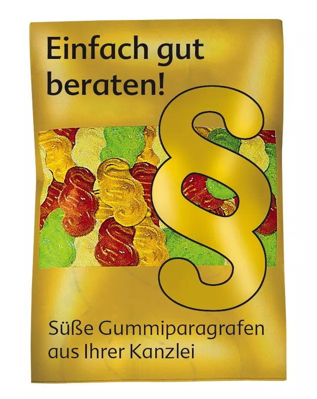 Packung: 50 Tütchen mit je 10 g leckerem Fruchtgummi in gemischten Farben in Paragraphen-Form.
