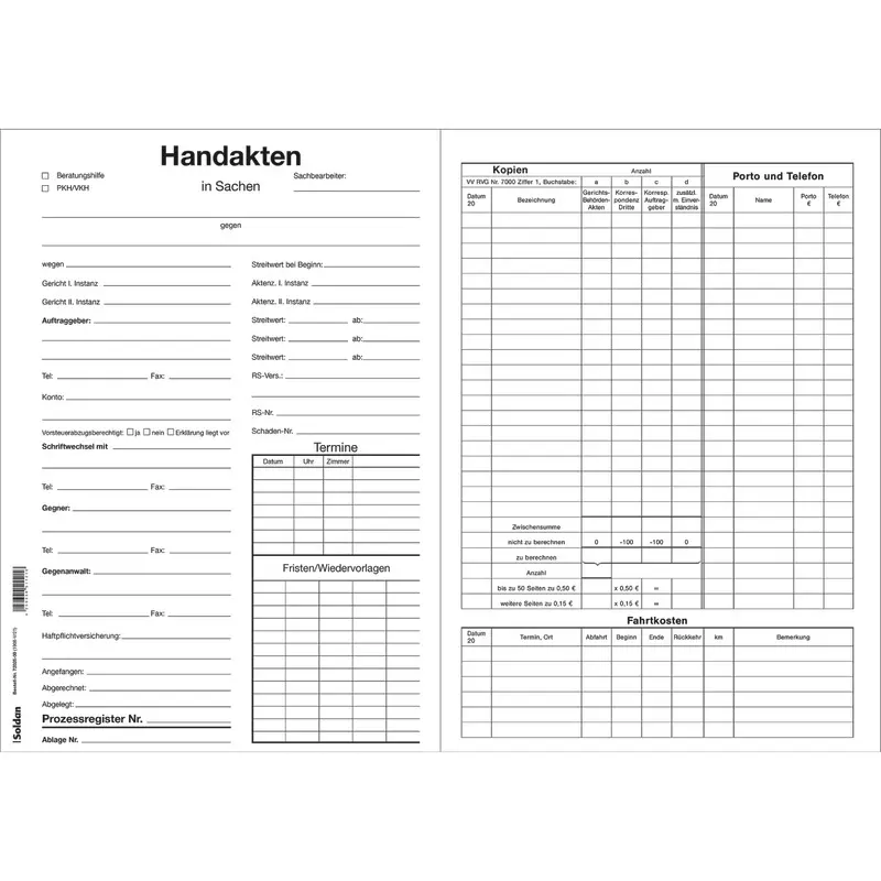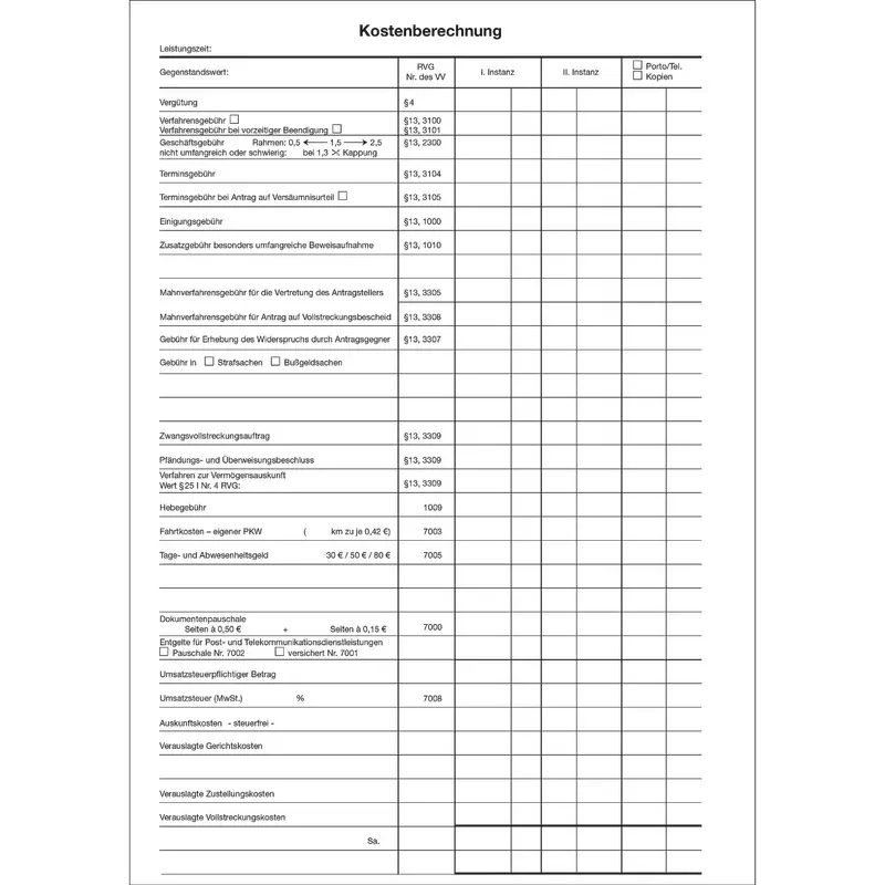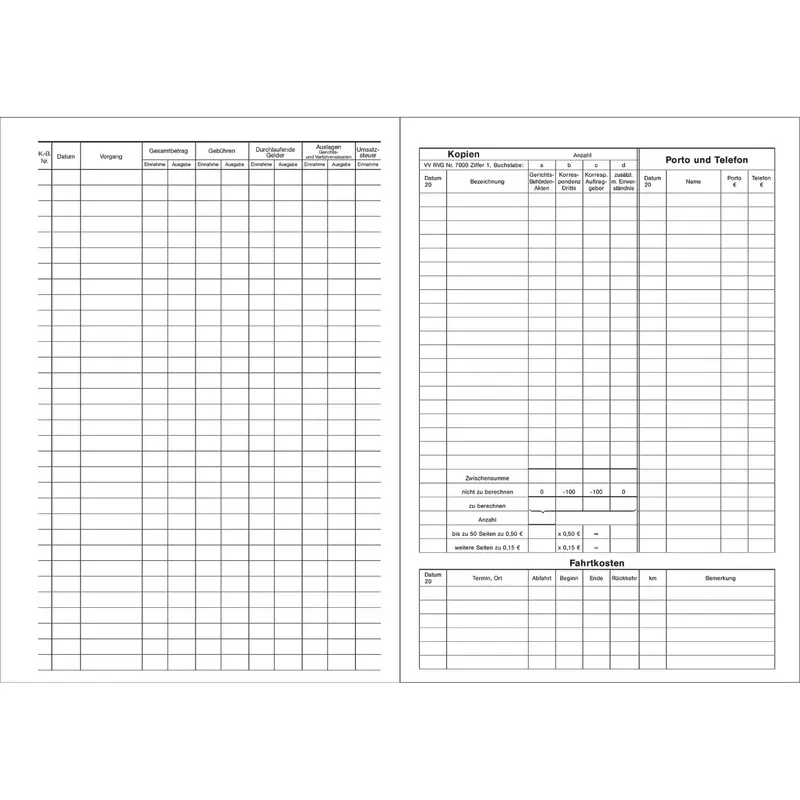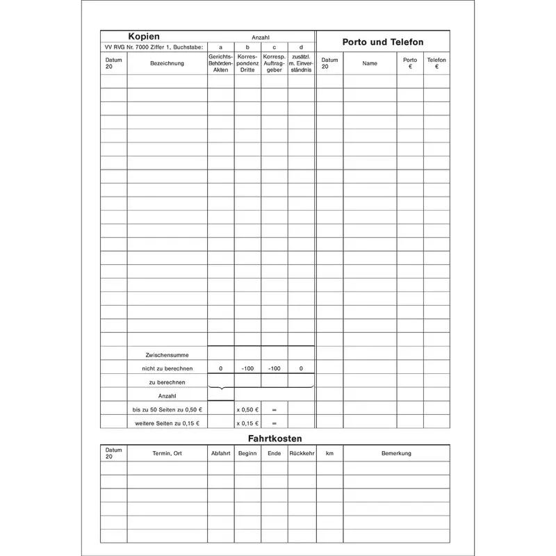 Informationen zur Akte, ausführliche Kostenberechnung, Auslagenerfassung passend zu VV RVG Nr. 7000.