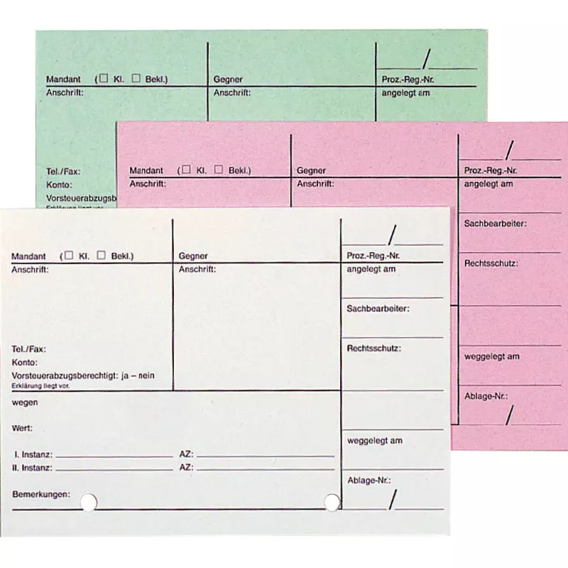 In drei Farben zur Unterscheidung nach Registernummer, Mandant und Gegner.