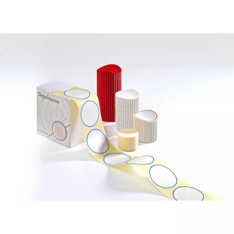 Aus Papier, selbstklebend, mit gewelltem Rand, in der praktischen Spenderbox. Zur Verwendung mit Siegel-Mehloblaten.