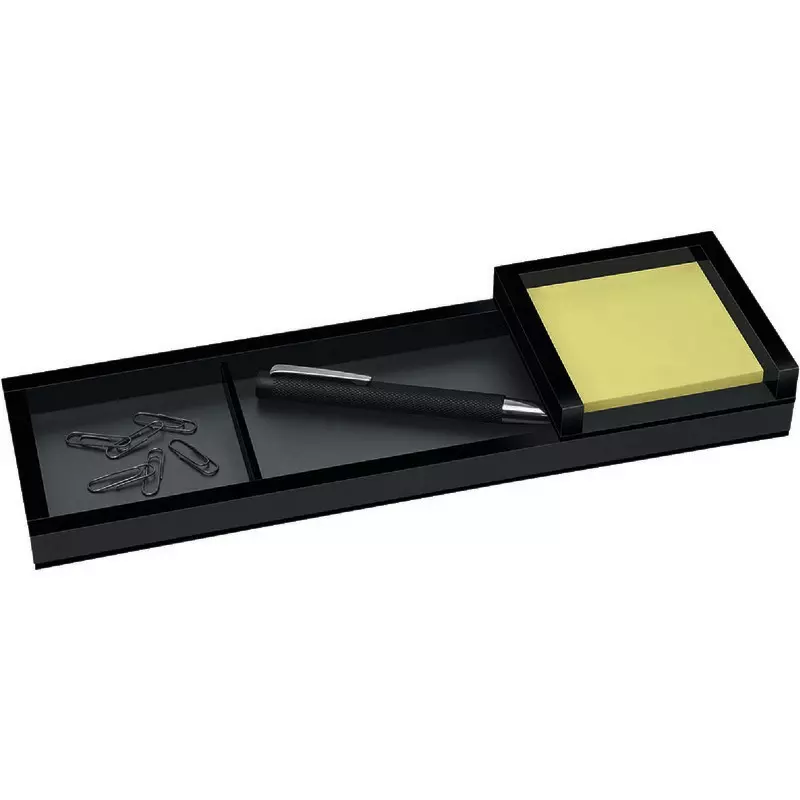 Die Hochwertigkeit dieser modernen Schreibtischserie wird durch die effektvolle Kombination aus schwarz mattiertem Acrylglas mit tiefschwarzen Akzenten besonders hervorgehoben. Zusätzlich bieten die transparenten Gummifüßchen dieser Stiftschale möbelschonenden, rutschfesten Stand. Die Zettelbox ist mit einem Haftnotizblock ausgestattet und lässt sich optimal in die Stifteschale der BLACK OFFICE-Serie einfügen.