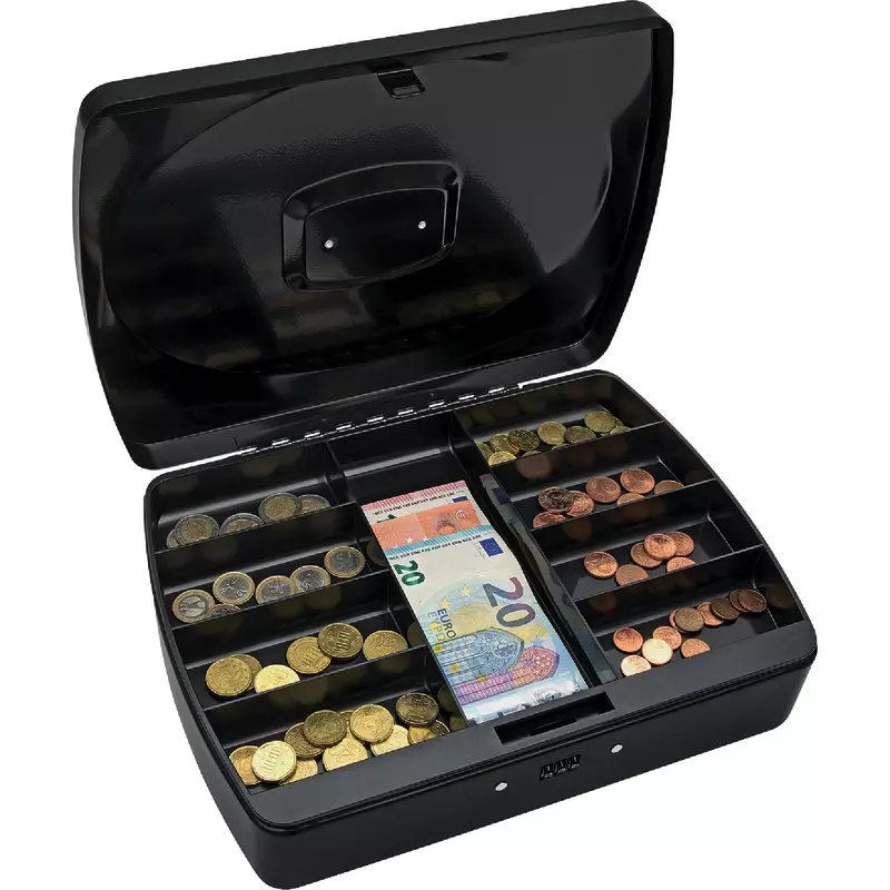 Geldkassette aus Stahl mit Zahlenschloss, Tragegriff und mit acht Fächern für Münzen und einem Fach für Geldscheine. Außerdem können DIN A4 Dokumente in der Kassette ungefalzt aufbewahrt werden.