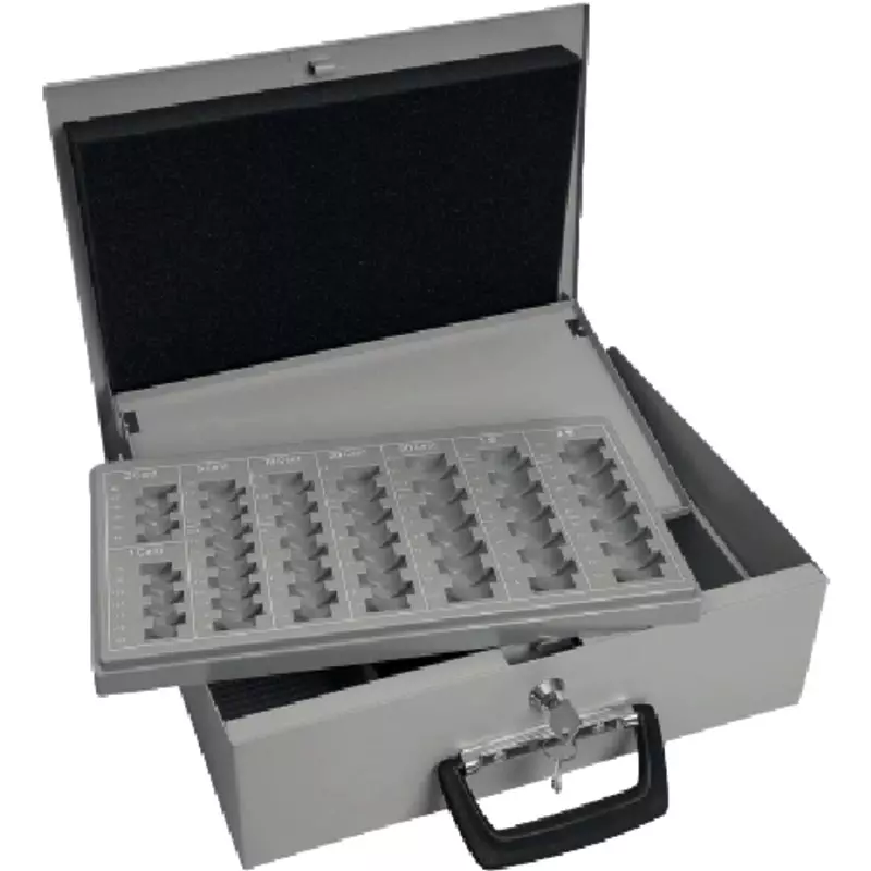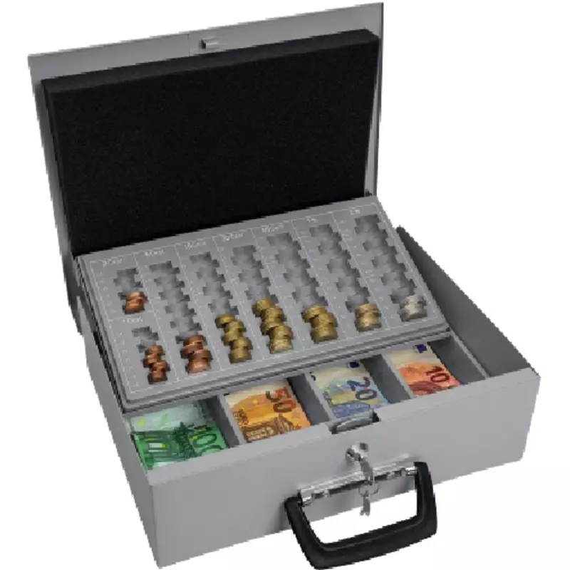 WEDO® UNIVERSA Kombinationskassette für Hart- und Papiergeld. Schlüssel-Nr. auf dem Schloß eingeschlagen. Der Hartgeldeinsatz gleitet automatisch nach hinten, wenn die Kassette geöffnet wird. Hartgeld wird durch Schaumstoff beim Transport gesichert. · Verwendung für Münzwerte: 1 Cent, 2 Cent, 5 Cent, 10 Cent, 20 Cent, 50 Cent, 1 Euro, 2 Euro · Schloss vorhanden: Ja · Anzahl der Schlüssel: 2 Schlüssel · Art der Verpackung: Karton · Material des Gehäuses: Stahl, pulverbeschichtet · Material des Hartgeldeinsatzes: Polystyrol · Gehäusefarbe: lichtgrau · Farbe des Einsatzes: grau · Produkttypbezeichnung: Universa · Werbliche Produkttypbezeichnung: Geldkassette Universa · Maße: 35,5 x 10 x 27,5 cm (B x H x T) · Anzahl der Fächer für Banknoten: 4 Fächer für Banknoten · Anzahl der Fächer für Hartgeld: 8 Fächer für Hartgeld · Anzahl der Reihen: 7 Reihen · Wertskala vorhanden: Ja · Verwendung für Währung: EUR · max. Aufnahmebetrag an Münzgeld: 225,70 Euro