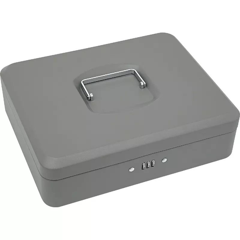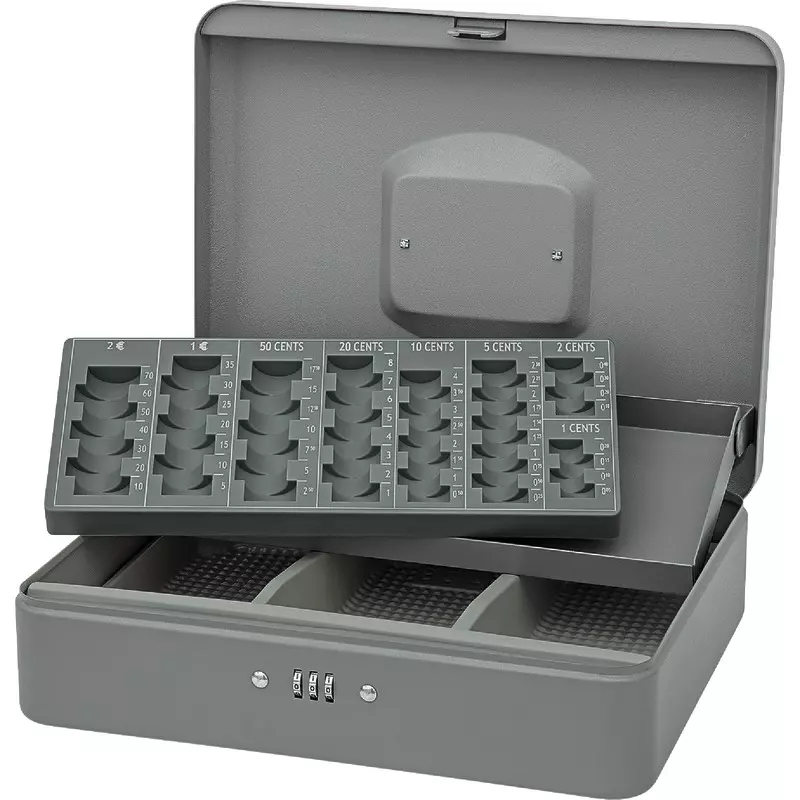 Geldkassette aus robustem Stahlblech mit Zahlenschloss, dreiteiligem Fächereinsatz für Geldscheine und einem herausnehmbaren Münzeinsatz mit acht Fächern, der beim Öffnen der Kassette automatisch nach hinten gleitet.