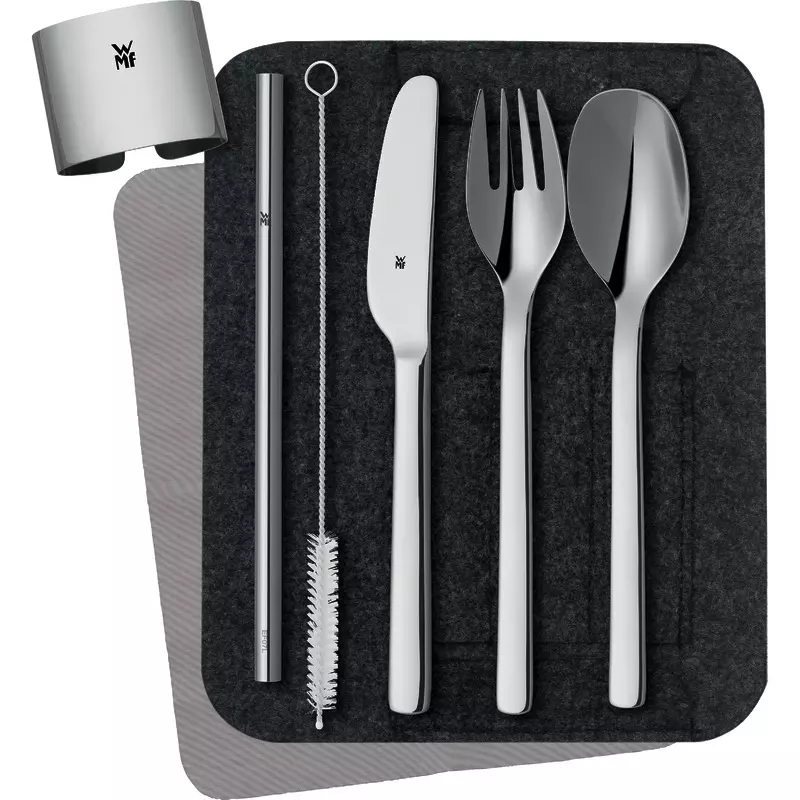 Vom Frühstück am Schreibtisch über das Mittagessen unterwegs bis hin zu Mitnahme-Getränken: jedes Teil wurde in seinen Proportionen genau durchdacht und für eine optimale Handhabung und Benutzung unterwegs entwickelt. Gefertigt aus hochwertigem Cromargan® enthält das My2Go Besteck-Set eine Gabel in „göffelähnlicher“ Form, ein abgerundetes Messer zum einfachen Schneiden und Streichen, einen Löffel mit tiefer Laffe, um den Tassen- oder Becherboden besser zu erreichen sowie einen Trinkhalm mit Reinigungsbürste zum Genießen leckerer Getränke unterwegs. Dieses langlebige Set ist die perfekte Antwort auf die Erfordernisse der Zeit und kann auf Wunsch auch mit einer persönlichen Gravur versehen werden.Ein praktisches Etui aus 100% recycelten Materialien ermöglicht eine sichere Aufbewahrung und einen einfachen sowie geräuschlosen Transport. Alle Besteckteile sind spülmaschinenfest, rostfrei, pflegeleicht, geschmacksneutral und beständig gegen Speisesäuren - für perfekte Hygiene, Tag für Tag.