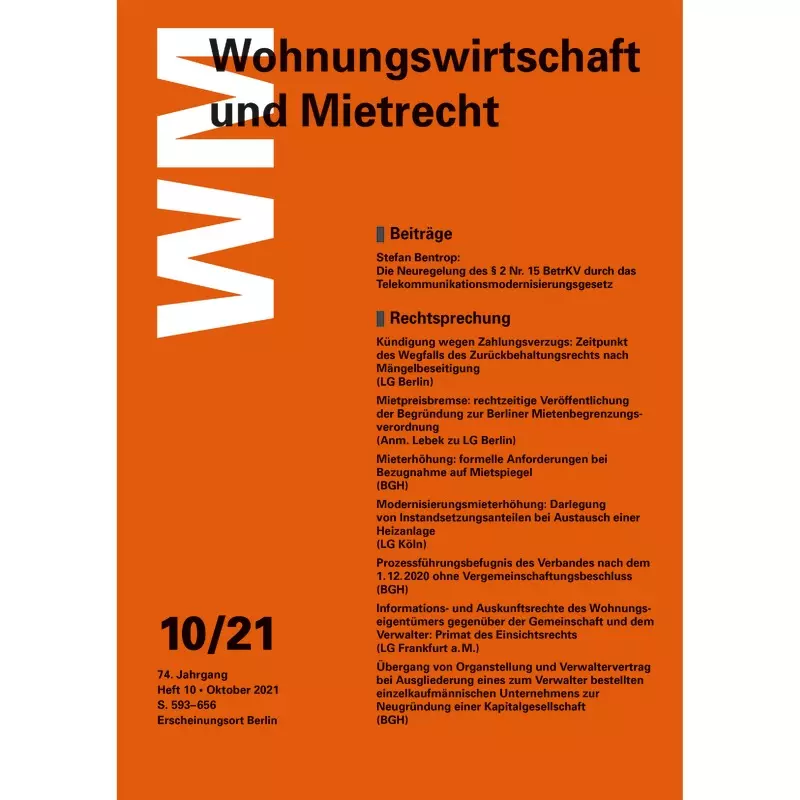 Wohnungswirtschaft & Mietrecht (WM) informiert umfassend, kompetent und zuverlässig. Es ist die Fachzeitschrift für Gerichte, Rechtsanwälte, Wohnungs- wirtschaft, Mieter, Vermieter und Wohnungseigentümer.